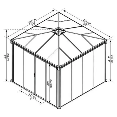 • Mõõdud: 295 x 295 cm, kõrgus 276 cm, räästa kõrgus 210 cm