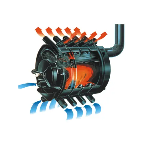 Need gaasid, mis ei põle alumises kambris ära, tõusevad üles, kus toimub nende täielik põlemine tänu sinna juhitud lisaõhule. Selline kolde ehitus kindlustab otstarbeka kütusekasutuse ja kõrge kasuteguri (75 %). Ahi on valmistatud kvaliteetsest katlaterasest, mis õigel kasutamisel tagab pika tööea (vähamalt 15 aastat). Bulderi võimsust reguleeritakse kolde ukses asuva õhuregulaatoriga. Puiduga kütmisel töötab õhusoojendi täislaetud koldega üle 8 tunni. Suur ahjuuks ja mahukas põlemiskamber lubab kütta ka jämedate puuhalgudega. Õhkkütteahju kütesekulu on palju väiksem kui traditsioonilisel ahjudel.