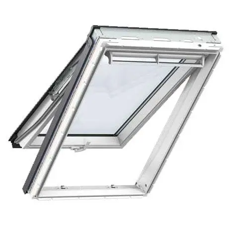 VELUX GPU - kahesüsteemne - alt panoraamaknaks avatav ja ülevalt pöördtelghingedega avatav liimpuidust valge hooldusvaba polüuretaankattega katuseaken