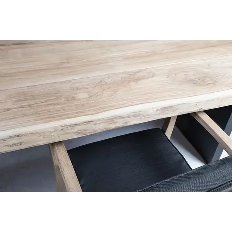 Kolmest paneelist koosnev servamata äärtega lauaplaat on valmistatud A-klassi tiikpuust. Peenlihvitud rustik viimistlusega pind on täielikult naturaalne oma looduslikus ilus ning seda ei ole õlitatud ega muul viisil keemiliselt töödeldud. Laua jalad on valmistatud alumiiniumist ja viimistletud halli pulbervärviga. A-klassi tiikpuu on täiuslik looduslik materjal luksusliku õuemööbli valmistamiseks. Puidu süü on tihe ja ühtlane ning kauni sametise läikega, värvus on kuldsetes nisu- ja meetoonides. Tänu suurele looduslike õlide sisaldusele on tiikpuu väga vastupidav niiskuse ning puidukahjurite suhtes. Tiikpuu talub väga hästi erinevaid ilmastikutingimusi ja säilitab oma suurepärase välimuse ja parimad omadused pikkadeks aastateks. Päikesevalguse ja niiskuse mõjul muutub laua pind aja jooksul kaunilt hõbehalliks. Selline värvimuutus on loomulik ega mõjuta puidu kvaliteeti. Eksklusiivne tiikpuust laud sobib hästi ka siseruumides kasutamiseks.