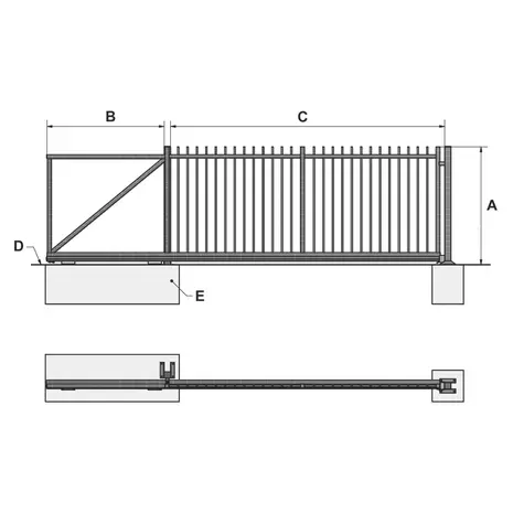 Joonisel: A - liugvärava kõrgus, B - vastukaalu osa, C - liugvärava laius, D - maapind, E - vundament