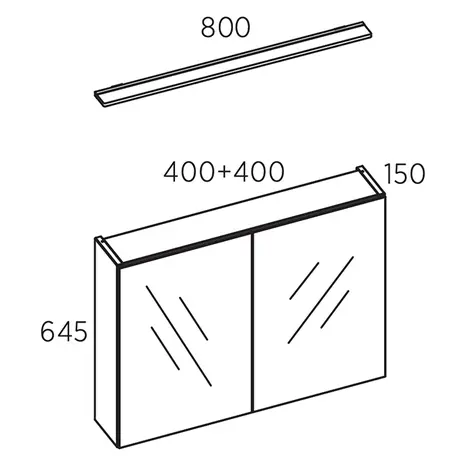 • Mõõdud: laius 800 mm (400 + 400 mm), kõrgus 645 mm, sügavus 150 mm