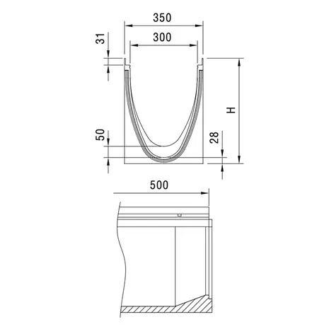 Avaleht/Ehitusmaterjalid/Teekatted/Sademevee ärajuhtimine/Renn-kanal ACO MULTILINE V 300, pikkus 50cm (rennikorpus astmelise kaldega 5cm), tsingitud terasest äärikuga