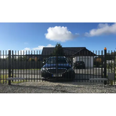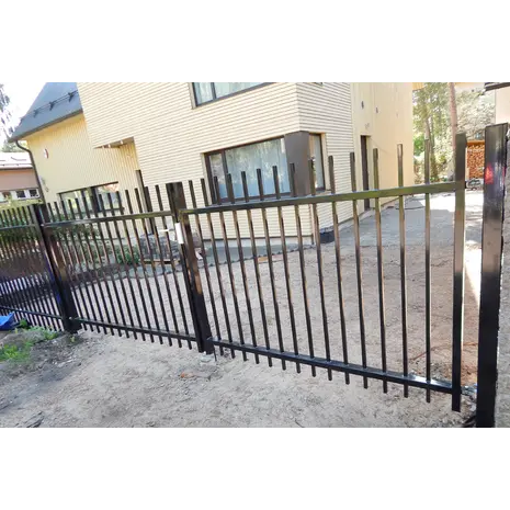 Autovärav varbaiale. Pind on tsingitud ja värvitud musta pulbervärviga. Väravat saab avada nii välja- kui sissepoole.