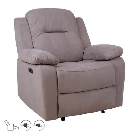 Recliner tüüpi tugitooli jalatoe asendit on võimalik muuta elektrilise mehhanismi abil. Jalatuge üles tõstes liigub seljatugi sujuvalt kaasa. Kattematerjal: 100% polüesterkangas.