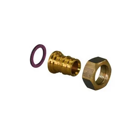Uponor Q&E otsik pöördmutriga PL. Materjal: messing. Lahtivõetav keermesühendus seinale kinnitatavate liitmike, filtrite või kuulkraanide ühendamiseks. Uponor Q&E rõngad tuleb tellida eraldi.