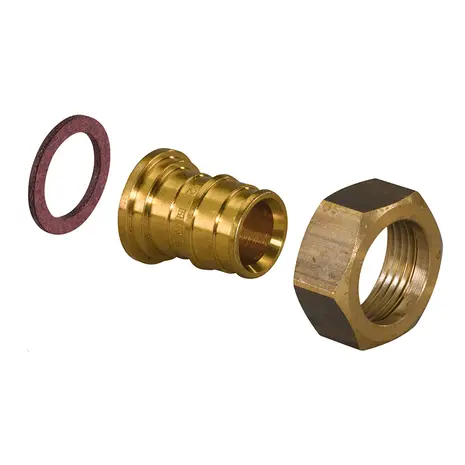 Uponor Q&E otsik pöördmutriga PL. Materjal: messing. Lahtivõetav keermesühendus seinale kinnitatavate liitmike, filtrite või kuulkraanide ühendamiseks. Uponor Q&E rõngad tuleb tellida eraldi.