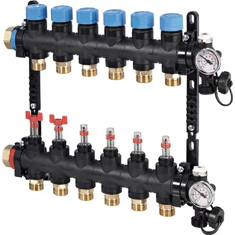 Integreeritud klappidega lattkollektor, magistraalide ühendus paremalt või vasakult 1" (lametihendiga). Pealevoolu kollektoril vooluhulga regulaatorid kütteringide tasakaalustamiseks ja sulgemiseks, tagasivoolul korkidega varustatud klapid. Õhueraldus ventiilid, täite- ja tühjendusventiilid. Küttekontuuri ühendus: G3/4"" eurokoonus. Väljundite samm: 50 mm. Materjal: klaasfiibriga armeeritud polüamiid. Kasutusala: põrandaküttele ja -jahutusele. Max rõhk: 6 bar, 60°C. Sobivus ajamitele 1087778 (24V) või 1087763 (230 V). Suurus 210 mm.