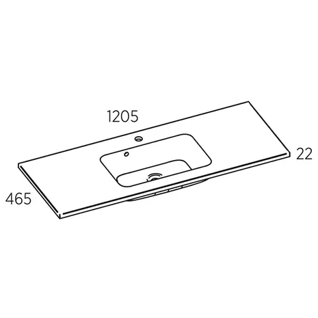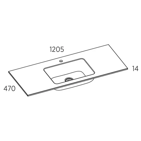 - Xonyx solid surface lettvalamu mõõtudega 1205 x 470 x 14 mm, integreeritud valamukausi mõõdud 48 x 32 cm