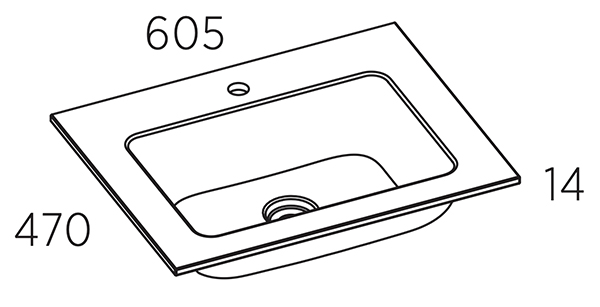 - Xonyx solid surface lettvalamu mõõtudega 605 x 470 x 14 mm, integreeritud valamukausi mõõdud 48 x 32 cm