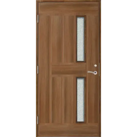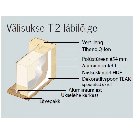 - Ukseleht: ukselehe paksus 62 mm, muster välisküljel, sisu polüsturool, kaetud mõlemalt poolt alumiiniumlehtedega ja HDF plaadiga.