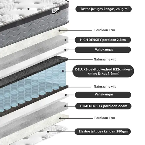 Kahepoolsel keskmise jäikusega ja käepidemetega madratsil on pakitud deluxe-pocket vedrustus (1,9 mm / äärtes 2,2 mm). Hele stretch-kangast madratsikate on nahasõbralikust ja pehmest puuvilla-polüestrist (kangakaal 280 g/m²). Madrats on pehmendatud kahe erineva kvaliteetse ja vastupidava poroloonikihiga, mis tagavad lihaste ja luustiku maksimaalse lõdvestuse. Kangas, vilt ja vatiin vastavad rahvusvahelisele Öko-Tex 100 standardile. Madrats on pakitud rulli, et seda oleks lihtsam transportida. Madrats vajab oma esialgse kuju taastamiseks kuni 2 tundi aega. Pärast ettevaatlikult kilepakendi eemaldamist asetada madrats voodi peale.