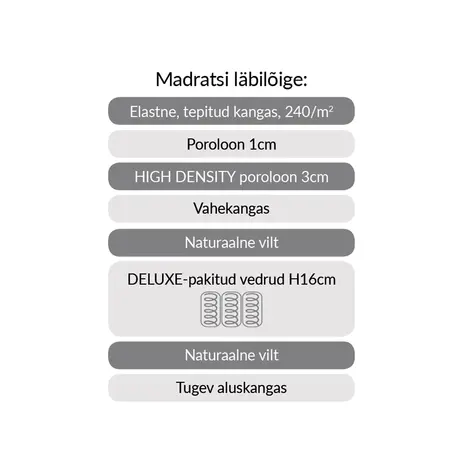 Pakitud vedruplokiga madrats on keskmisest jäigema vedrustusega (pocket vedrustus 2,1 mm / äärtes 2,2 mm). Hele stretch-kangast madratsikate on nahasõbralikust ja pehmest viskoos-polüestrist (kangakaal 240 g/m²). Madrats on pehmendatud kvaliteetse ja vastupidava 3 cm poroloonikihiga, mis lisab magamismugavust ja pakub kehale piisavat lõõgastust. Kangas, vilt ja vatiin vastavad rahvusvahelisele Öko-Tex 100 standardile. Madrats vajab oma esialgse kuju taastamiseks kuni 2 tundi aega. Pärast ettevaatlikult kilepakendi eemaldamist asetada madrats voodi peale.